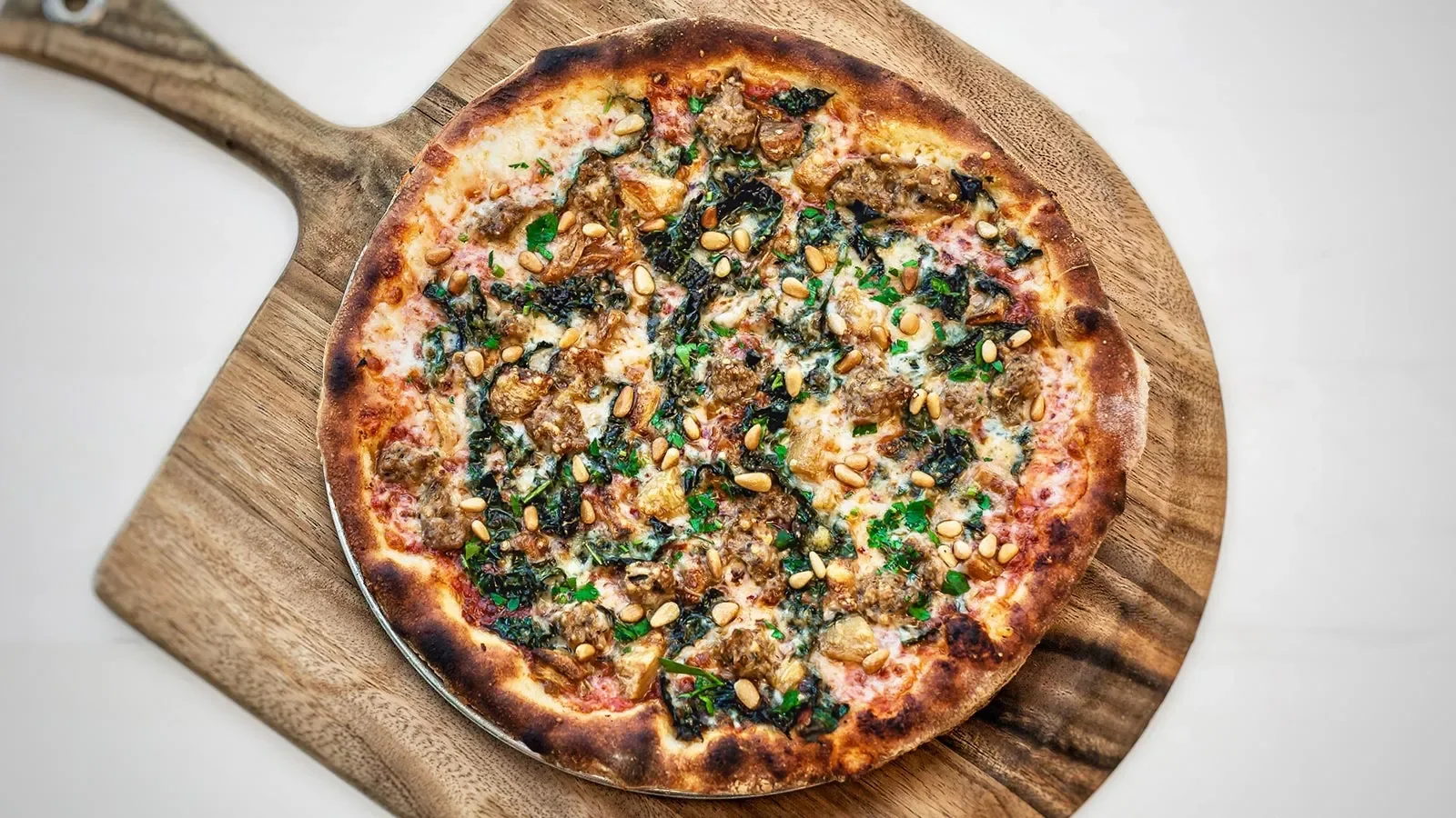 We bake our pizzas in brick ovens the way tradition-minded Italians have been baking pizzas for hundreds of years. Because our pies are baked directly on a super-hot brick floor, the crust comes out crisp and darker than the typical American pizza – often a bit black. If you are a crust lover, you will find our crust distinctively delicious. All pizzas prepared with mozzarella and tomato sauce unless noted Mini (7˝) serves 1 Small (10˝) serves 1–2 Medium (13˝) serves 2–3 Large (15˝) serves 3–4
